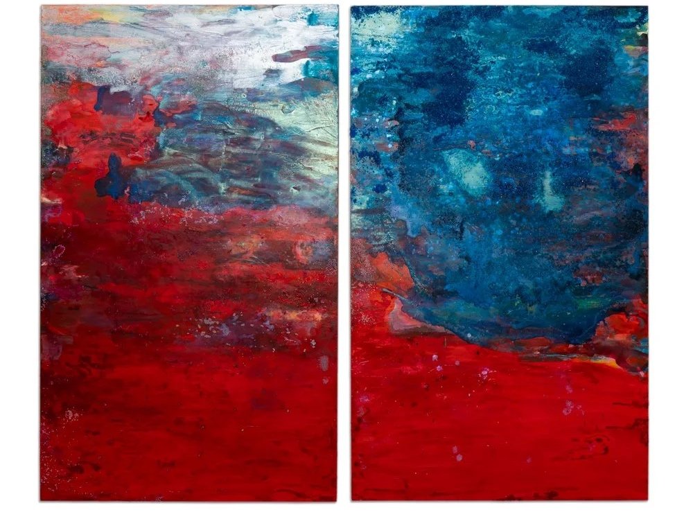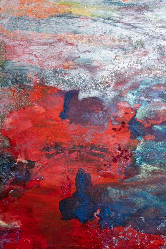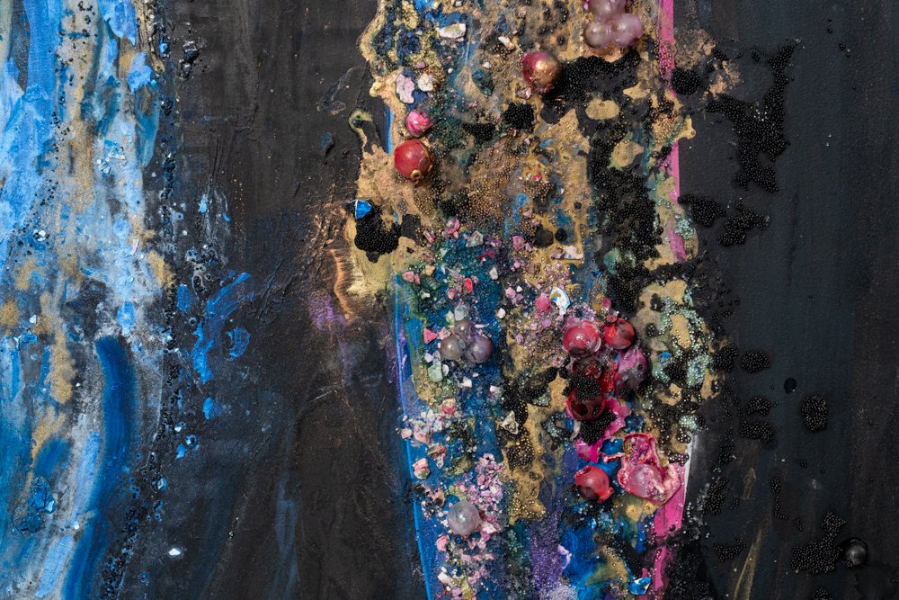 Ink, acrylic paint, crushed glass, glass beads