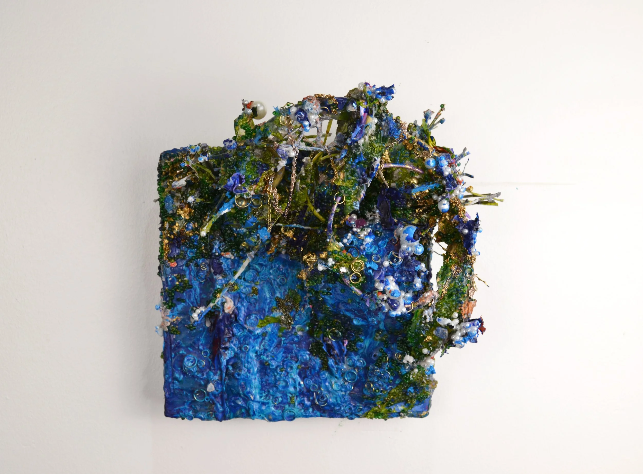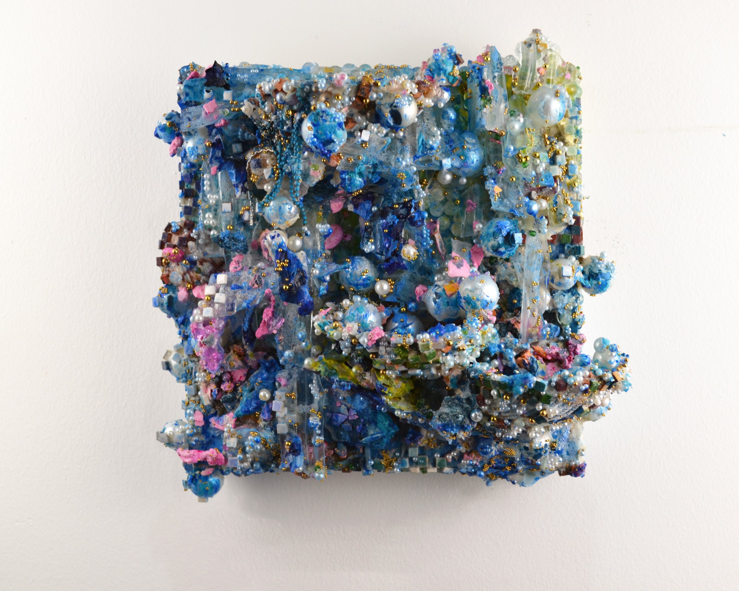 Acrylic, gouache, ink, plaster, grout, faux pearls, glass beads, repurposed plastic, fashion jewelry on wood board