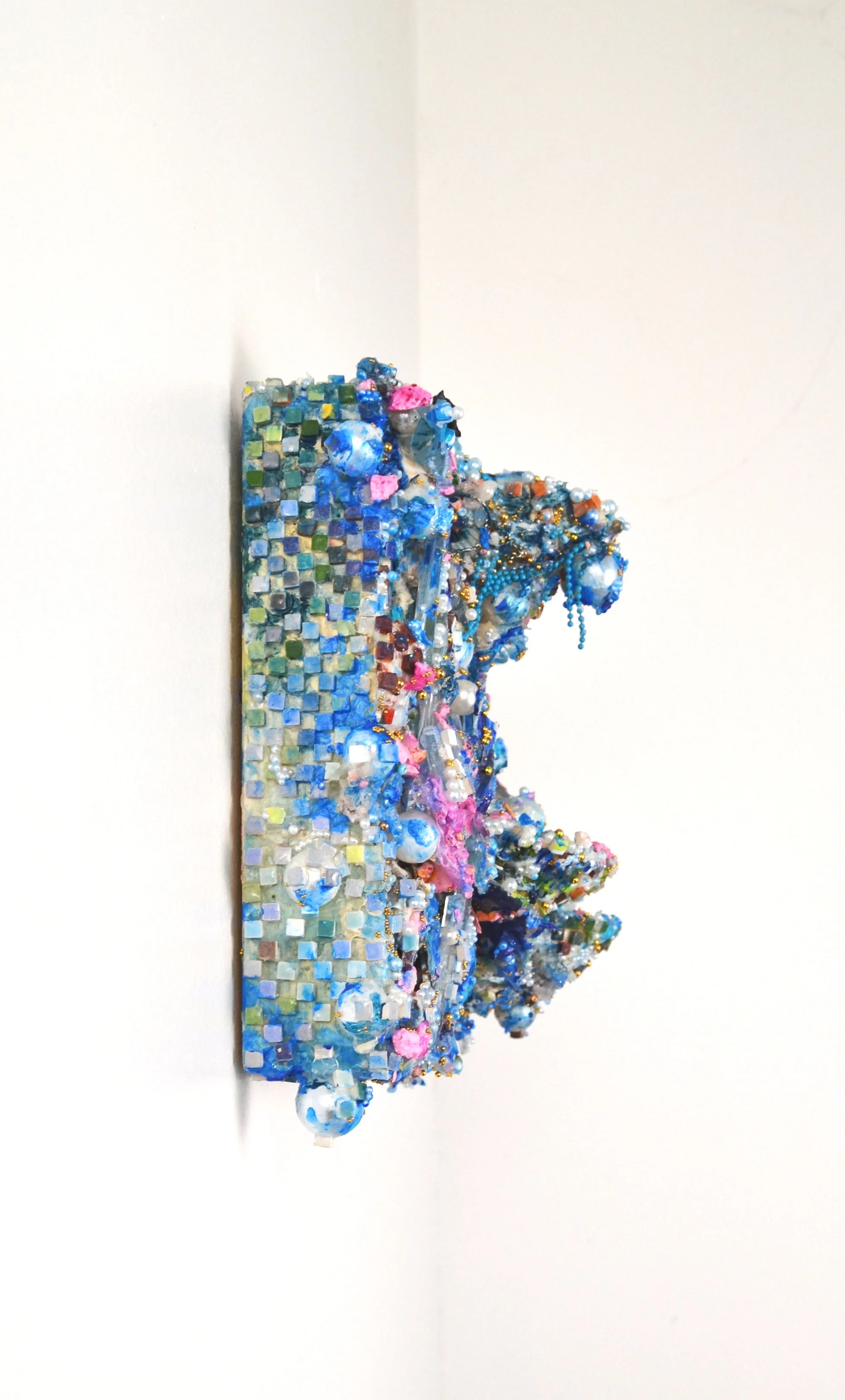 Acrylic, gouache, plaster, grout, faux pearls, glass beads, stained glass, micro beads, ceramic tiles, shells on wood board